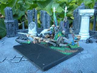 Here is a shot showing the wolves removed. The banner poles lost both the tips over the years. I replaced them with bits from a GW plastic Skeleton sprue.